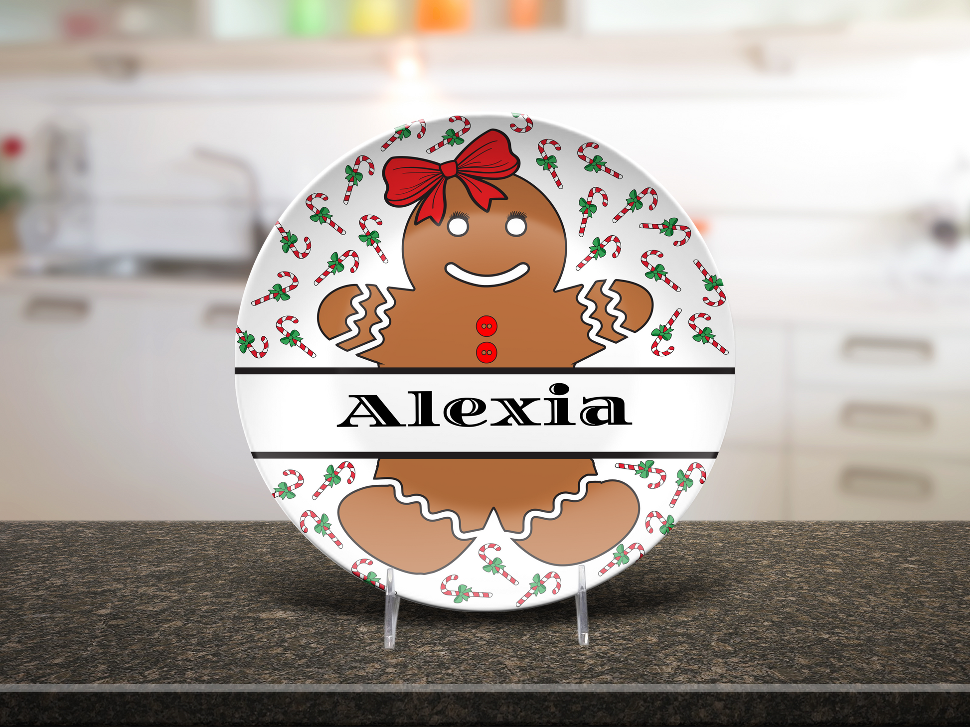 Sweeten your holiday season with our adorable Customizable Gingerbread Girl Dinner Plate. Great for a plate of treats, or your yummy Holiday Dinner. Add name of your choice in personalization field before adding plate to your cart.